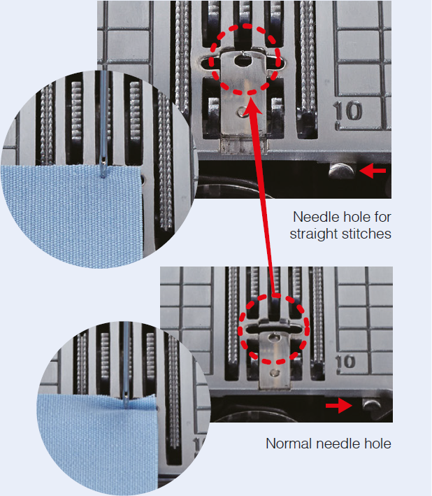 Simply slide the front lever to switch to a single needle hole. Sew the lightest fabrics with perfect needle permeation. The single needle plate will not allow fabrics to be pushed into the needle hole. Free motion stitch with precision and perfection. Sew with confidence, when the single needle hole plate is set, only the straight stitch patterns can be selected.